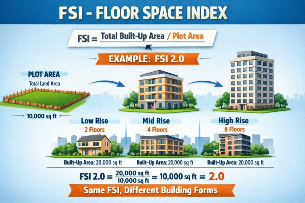 FSI (Floor Space Index) म्हणजे एखाद्या प्लॉटवर किती एकूण बांधकाम करता येईल याचे प्रमाण.